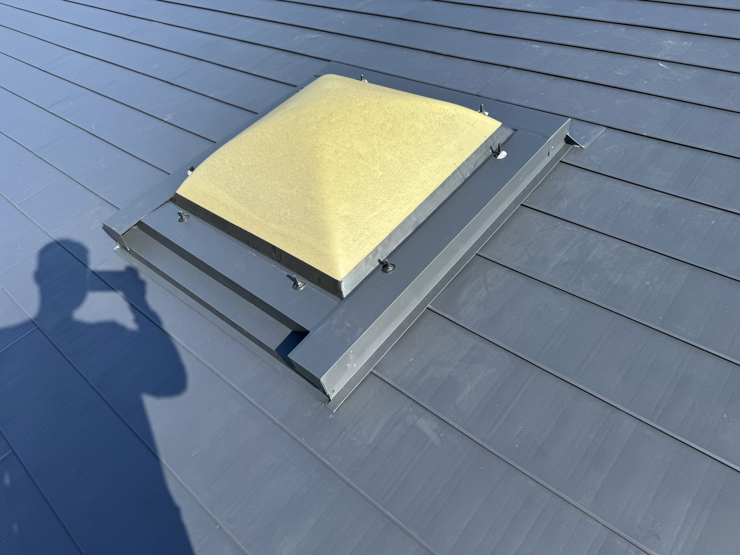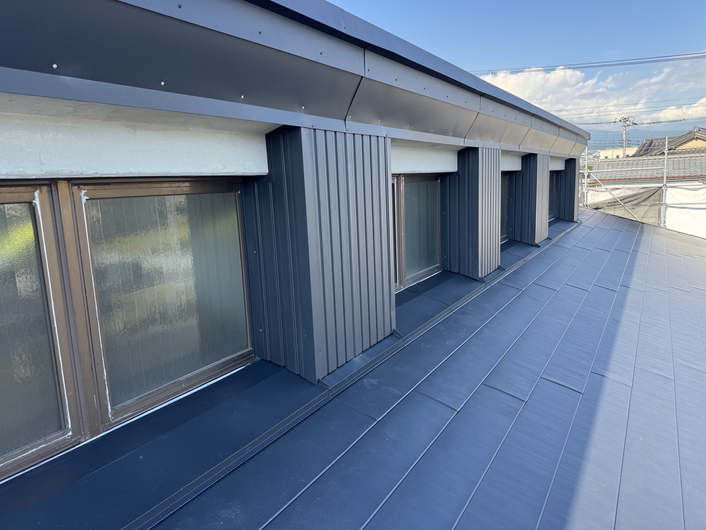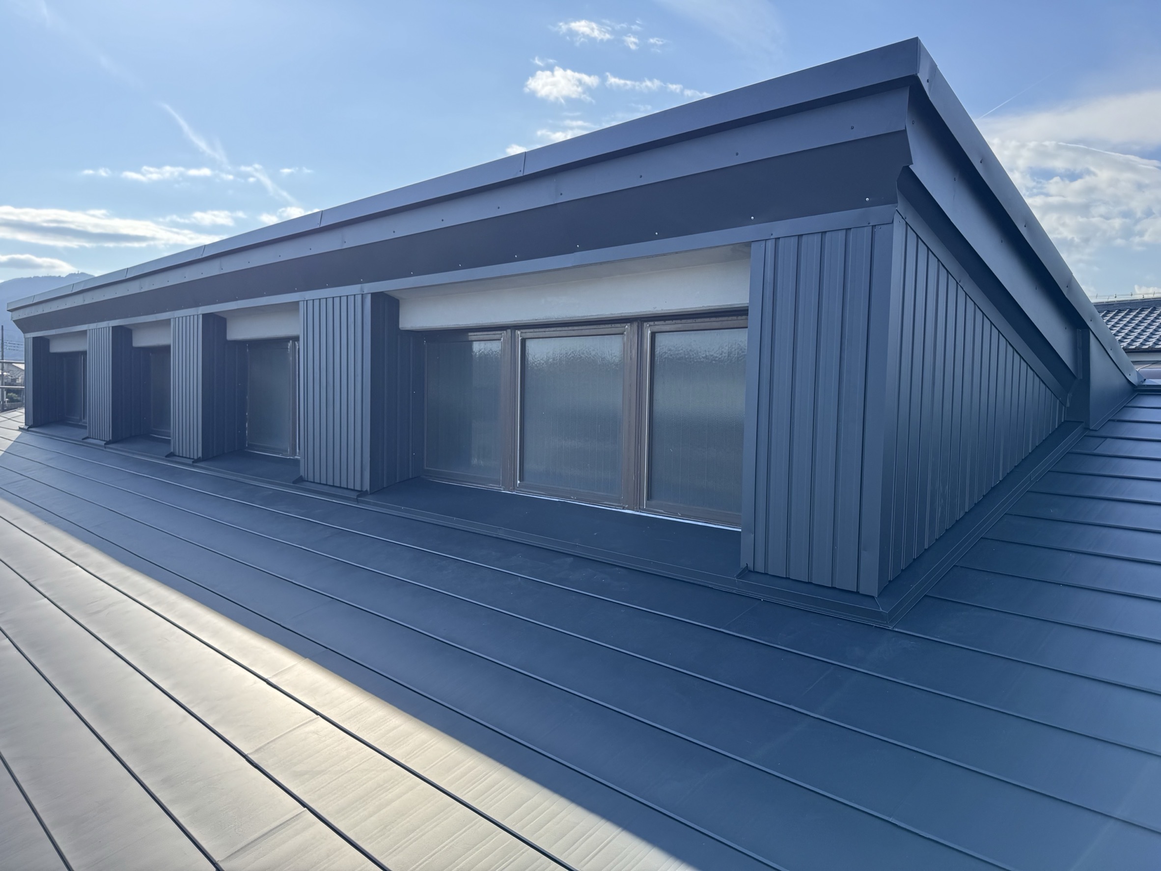 板金屋さんと話し合いを重ね、雨仕舞いを丁寧に行い、ガルバリウム鋼板にて、屋根カバー工法を施工させていただきました。