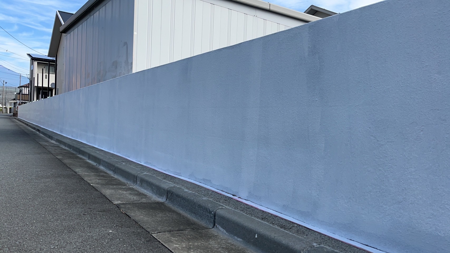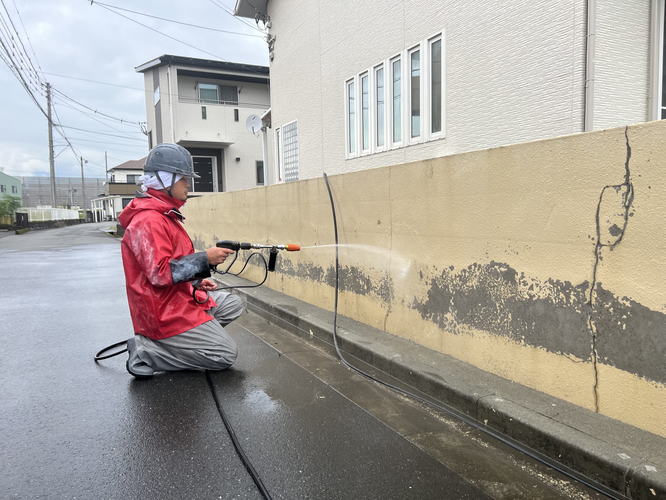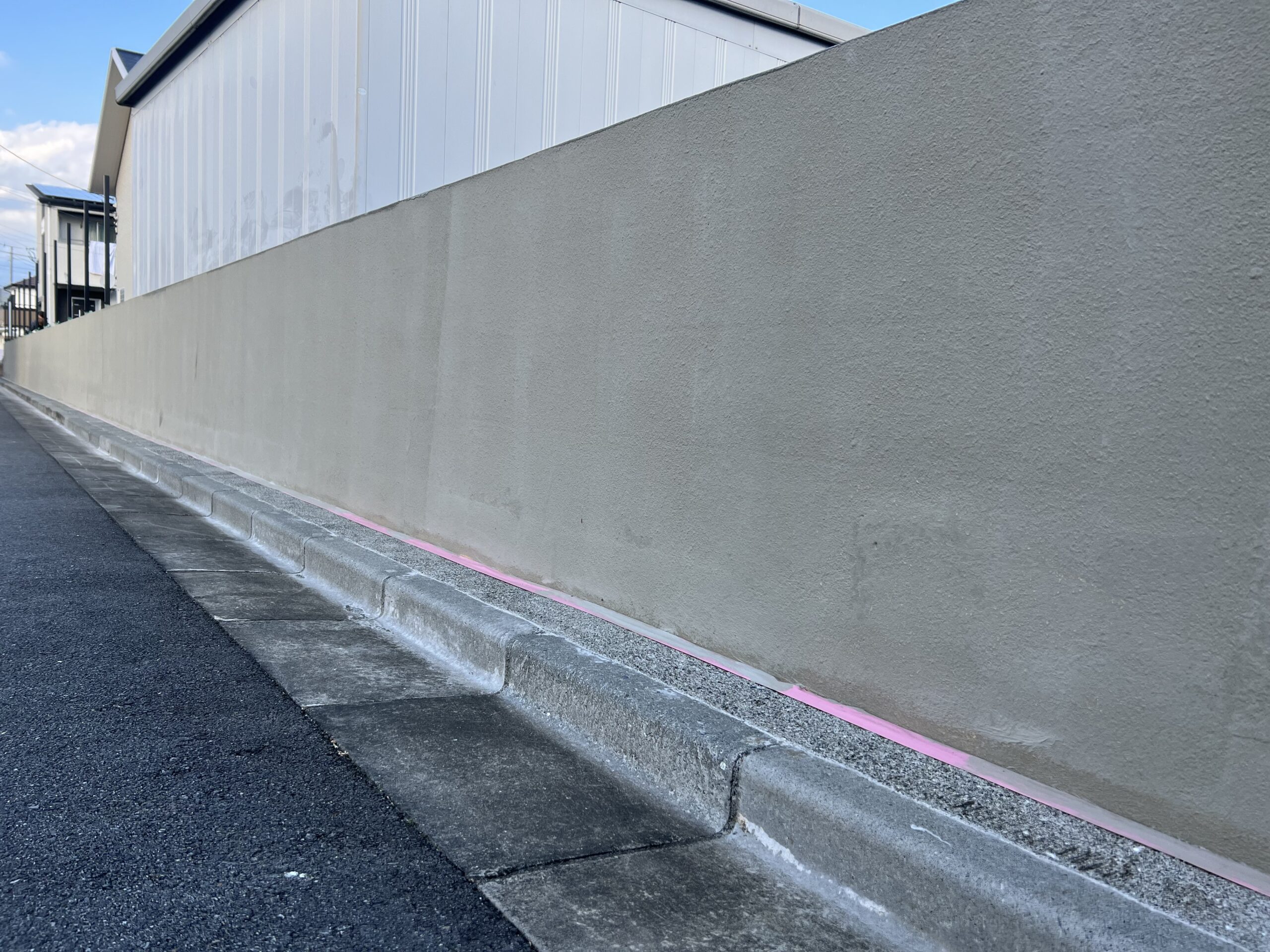 ひび割れの下地処理を丁寧に行い、透湿性の高い塗料(擁壁コート)で、施工させていただきました。